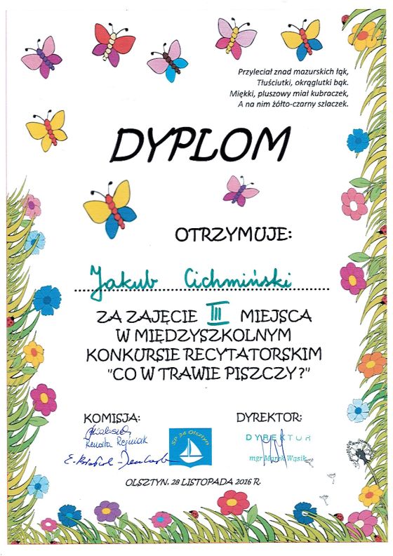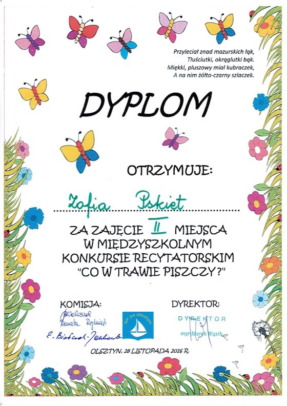 28 listopada 2016 w Szkole Podstawowej nr 34 w Olsztynie odbył się konkurs recytatorski “Co w trawie piszczy”. Naszą szkołę reprezentowało sześć osób: Pola Zglińska, Zofia Pskiet, Julia Bezlapowicz, Amelia Banaszek, Mateusz Sosnowski i Jakub Cichmiński. Poziom konkursu był wysoki, a konkurencja spora. Mimo to naszym reprezentantom udało się zająć aż trzy miejsca: