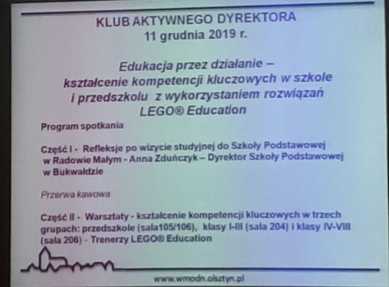 Z dumą zawiadamiamy, że jeden z naszych nauczycieli- Pani Anna Bakuła, trener Lego Education, w ramach przedświątecznego spotkania Klubu Aktywnego Dyrektora w WMODN w Olsztynie, przeprowadziła fantastyczne szkolenie w zakresie kształcenia kompetencji kluczowych z wykorzystaniem rozwiązań Lego Education. Spotkanie cieszyło się ogromnym uznaniem dyrektorów, którzy podkreślali niesamowite możliwości podniesienia jakości edukacji. Cieszymy się, że mogliśmy podzielić się swoją wiedzą zwłaszcza, że jesteśmy jedną z nielicznych placówek starających się o tytuł „Ambasadora Przyjaznej Edukacji”.
