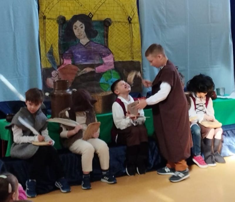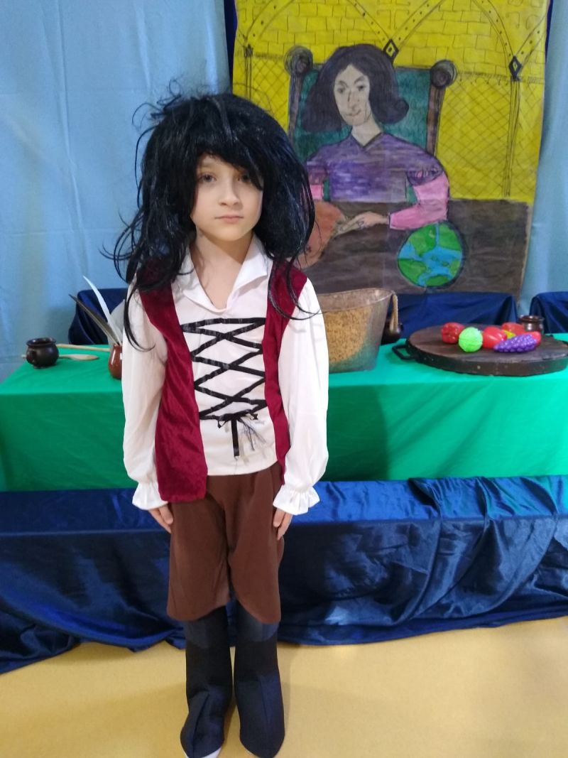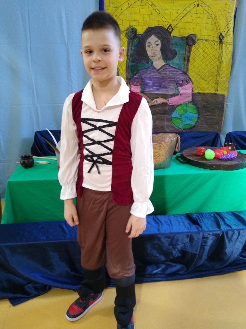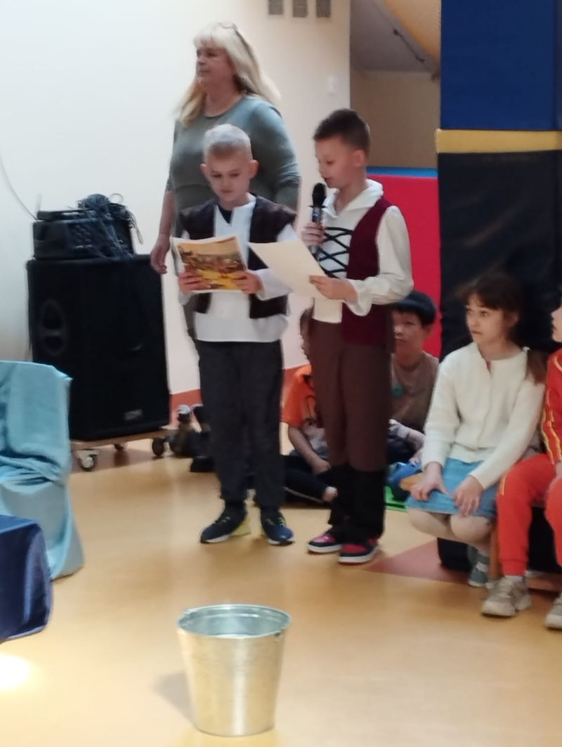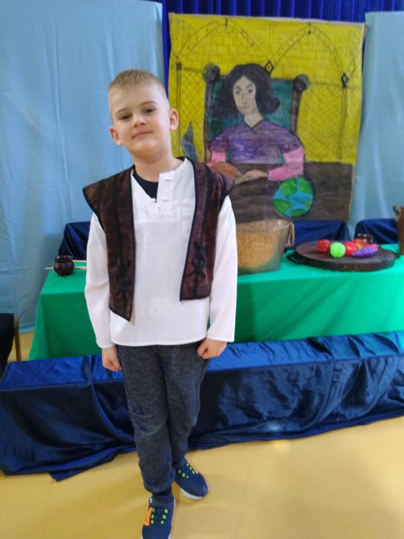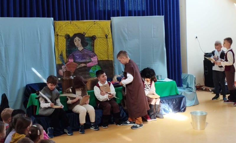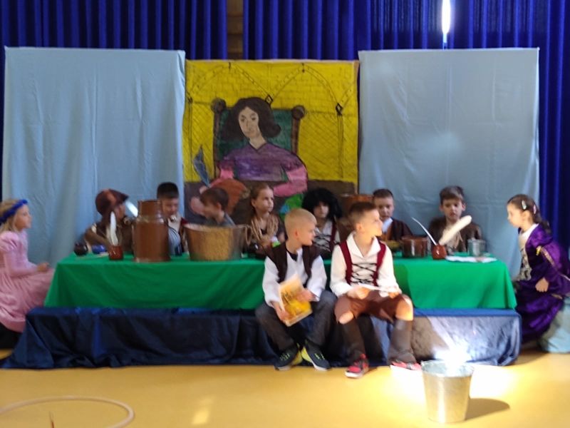 Klasa 1 szmaragdowa pokazała uczniom klas 0- 3 przedstawienie pt. „O chłopcu, który sięgnął do gwiazd”. Spektakl przybliżył młodym widzom czasy, w których żył Mikołaj Kopernik. W drugiej części spotkania odbył się konkurs wiedzy na temat życia i działalności wielkiego astronoma.