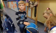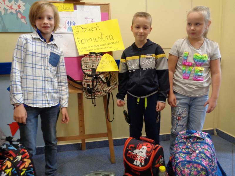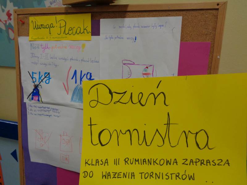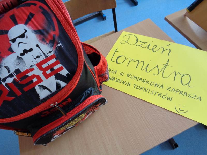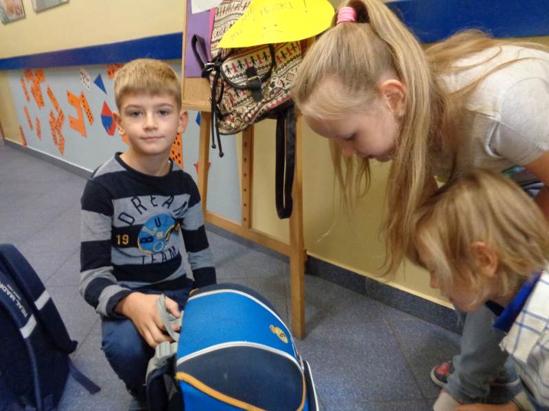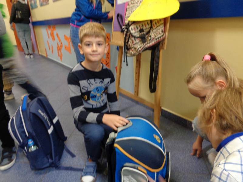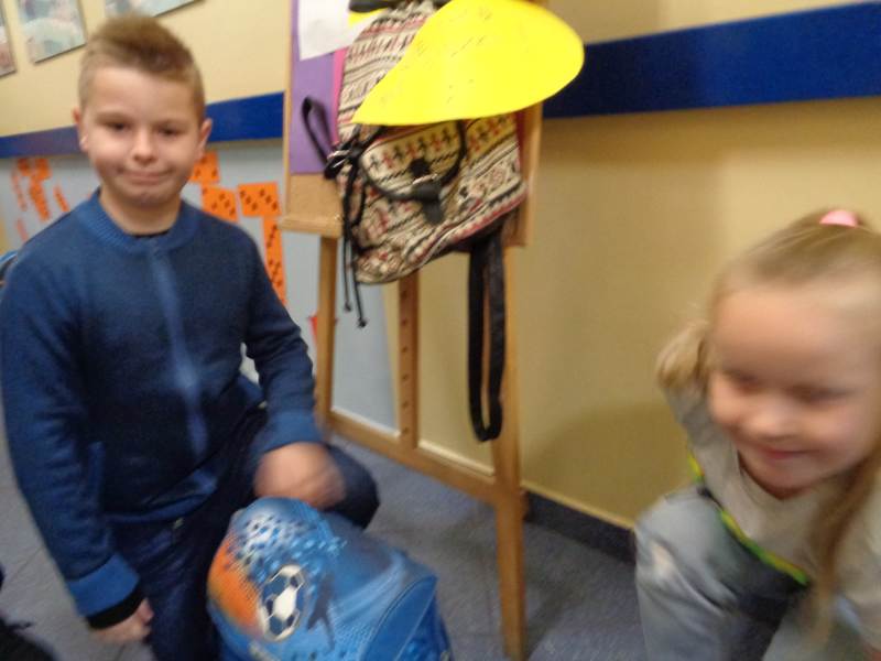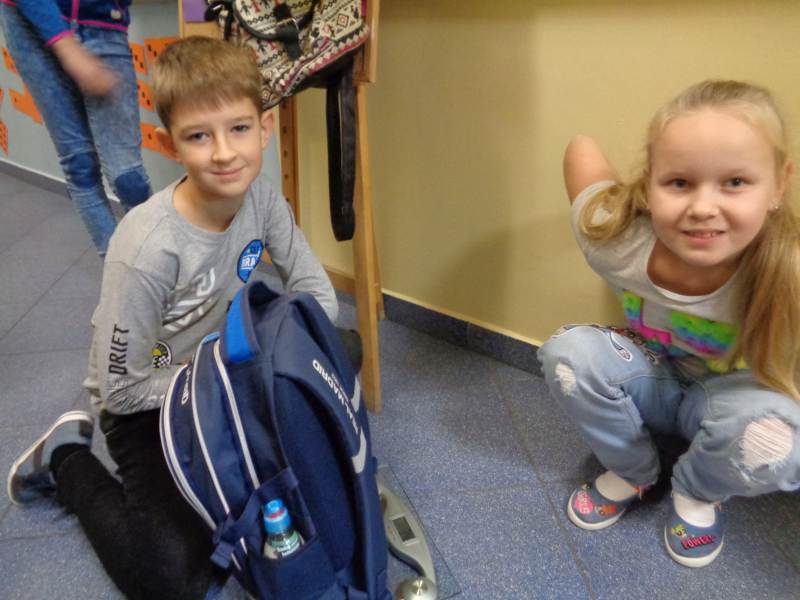 Tego właśnie dnia dzieci z klasy III rumiankowej czekały na uczniów wchodzących do szkoły i ważyły plecaki. Starsi uczniowie mieli cięższe plecaki od młodszych kolegów. Młodsze dzieci razem z nauczycielem podawały propozycje, co zrobić aby plecaki były lekkie każdego dnia. Uczniu. Ile waży Twój plecak? Co możesz z niego wyjąć. Czas na decyzję.