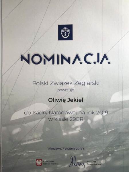 Uczennica Naszej Szkoły Oliwia Jekiel powołana została do Kadry Narodowej Juniorów w żeglarskiej klasie 29er. Ceremonia wręczenia nominacji odbyła się w siedzibie Polskiego Komitetu Olimpijskiego w Warszawie, podczas uroczystej Gali Polskiego Związku Żeglarskiego podsumowującej, żeglarski sezon 2018. Reprezentujące barwy Nauticus Yacht Club Olsztyn, żeglarska załoga Magdalena Chyła i Oliwia Jekiel, objęta została przygotowaniami do Mistrzostw Świata w klasie 29er, które na przełomie lipca i sierpnia rozegrane zostaną w Gdyni. Gratulujemy !!!